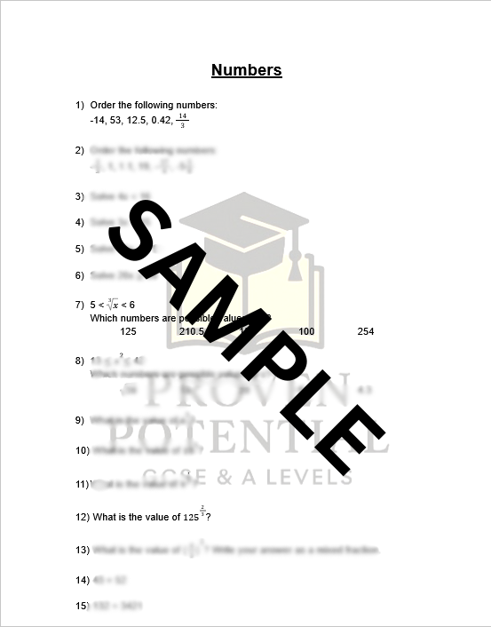 This is a set of 60 questions based on the AQA specification of the ‘Numbers’ topic. A worked solution document is included. This worksheet is designed for the AQA worksheet but can be used for other exam boards.